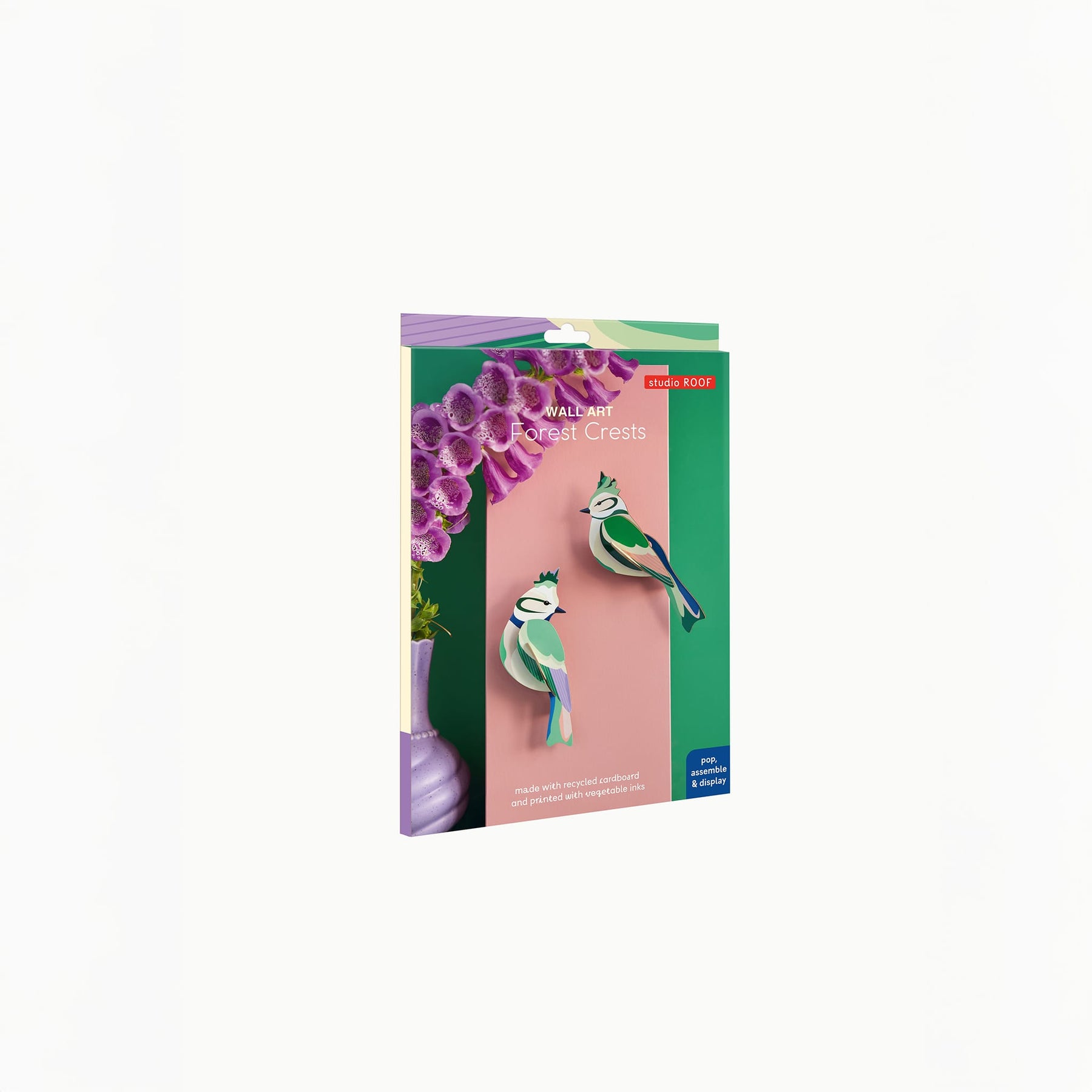 Made from recycled cardboard and printed with vegetable inks, the Forest Crests are as sustainable as they are artistic. Delivered flat-packed, they are easy to assemble into charming 3D decorations. Once built, the largest bird measures 5 × 4.5 × 15 cm, creating a delightful decorative detail for any room.